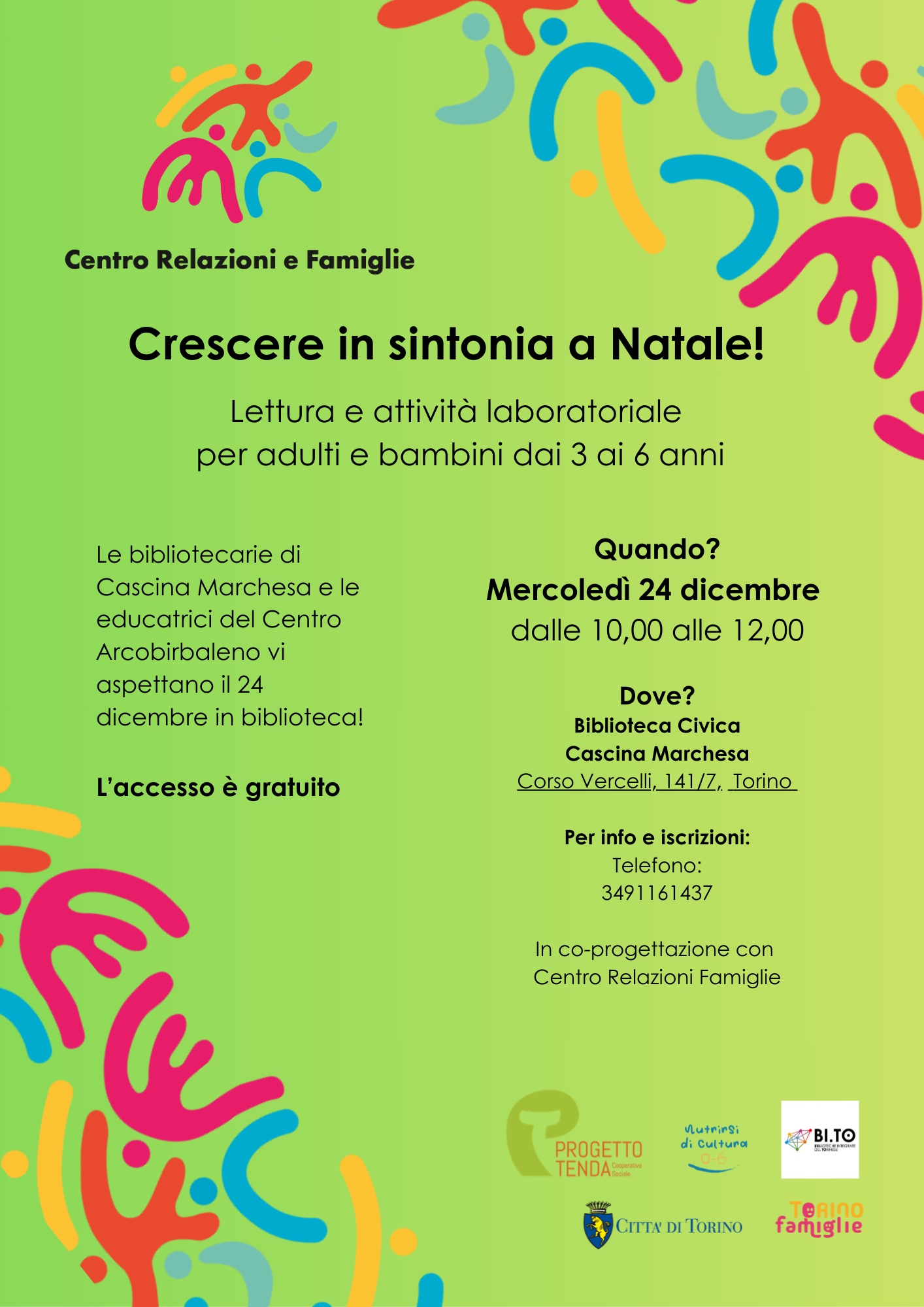 La Cooperativa Progetto Tenda, in coprogettazione con il Centro Relazioni e Famiglie della Città di Torino, in occasione delle feste natalizie organizza un evento gratuito di lettura e laboratori per genitori e i loro bimbi dai 3 ai 6 anni presso la Biblioteca Civica Cascina Marchesa in corso Vercelli 141/7.