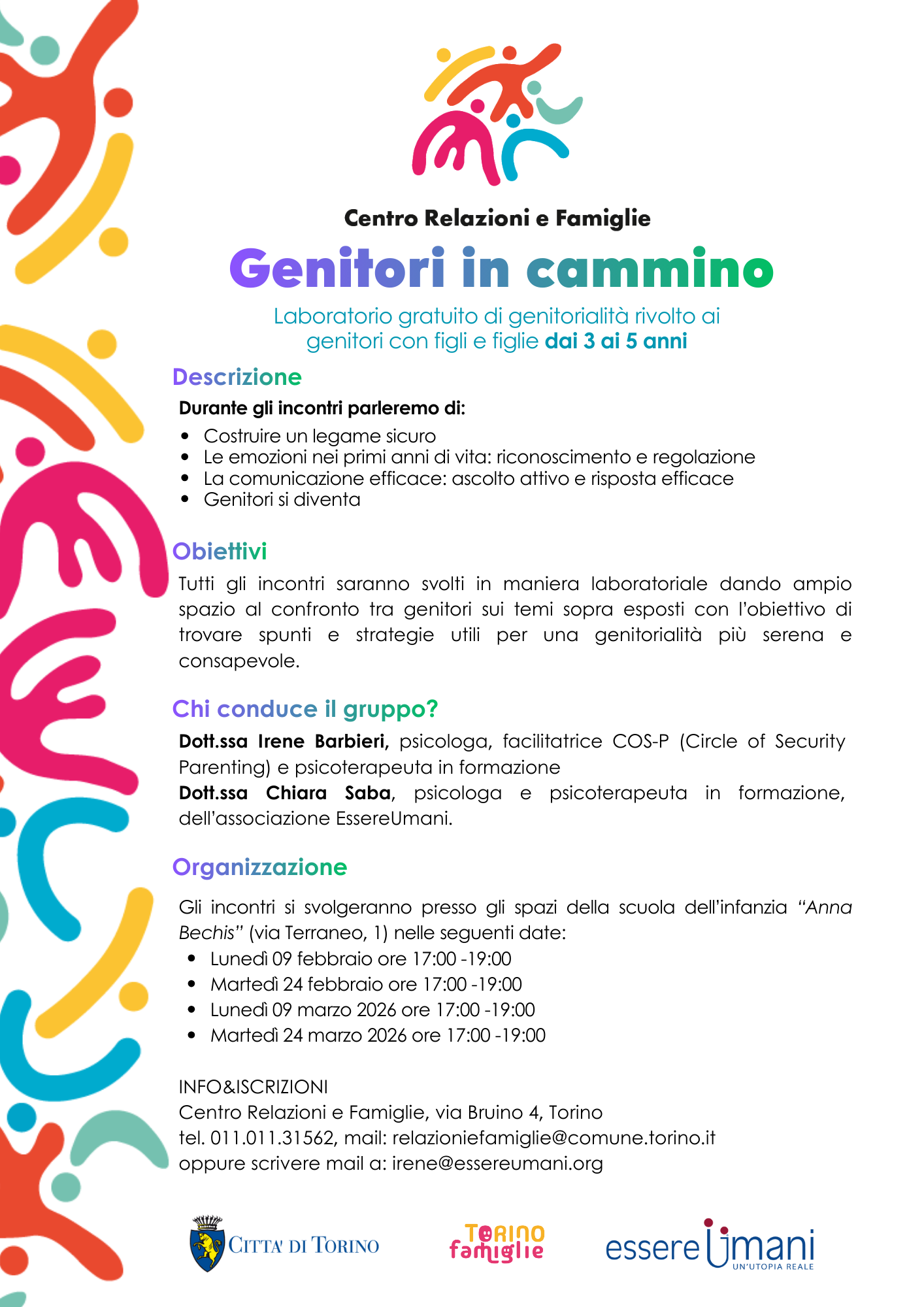 Per iscrizioni contattare il Centro Relazioni e Famiglie al numero 01101131562 o via mail all’indirizzo relazioniefamiglie@comune.torino.it oppure scrivere a irene@essereumani.org