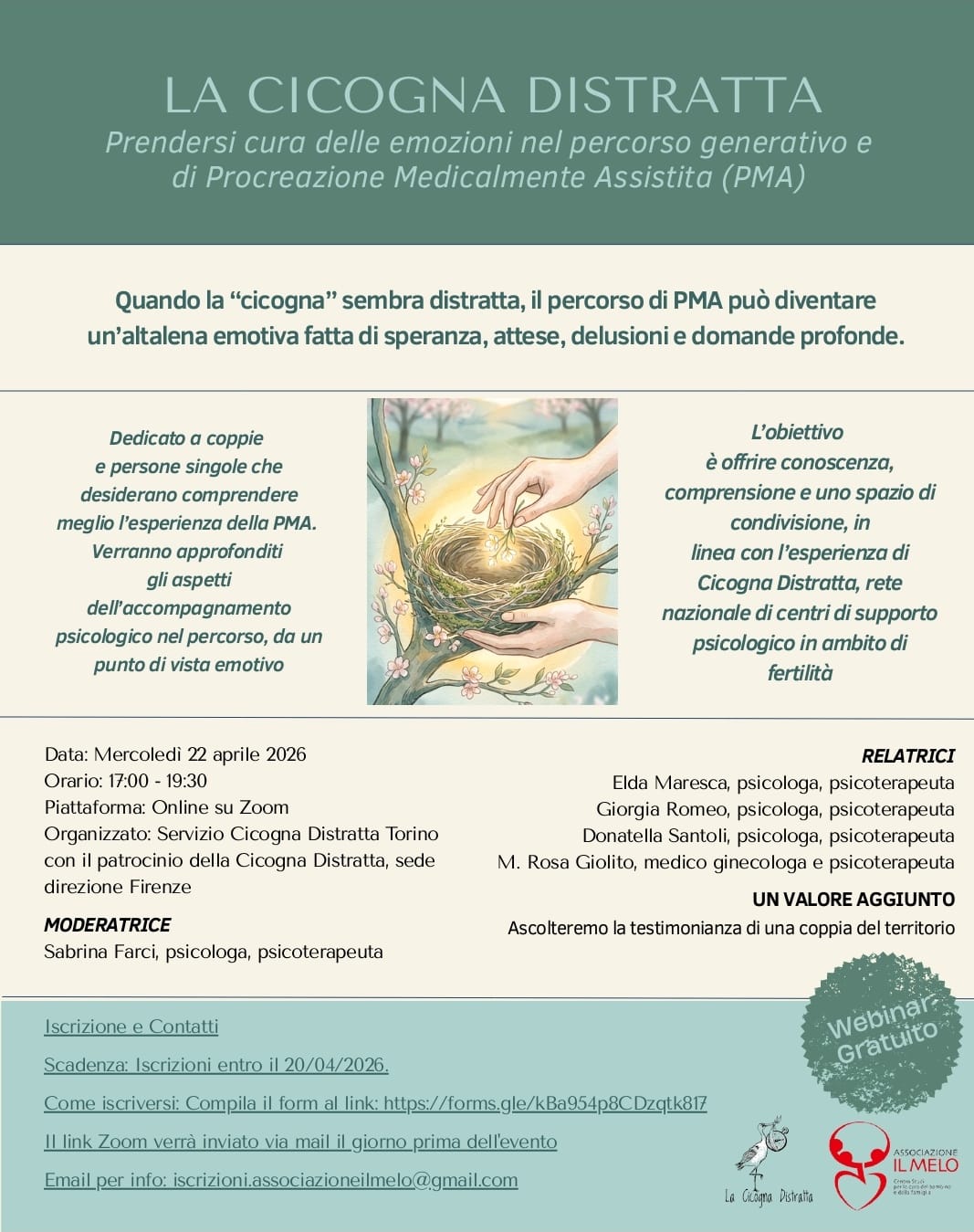 Il servizio “Cicogna Distratta” dell’associazione Il Melo propone per mercoledì 22 aprile 2026 dalle ore 17,00 alle ore 19,30 un webinar gratuito su piattaforma Zoom dedicato a coppie e persone singole che desiderano comprendere meglio l’esperienza della PMA.