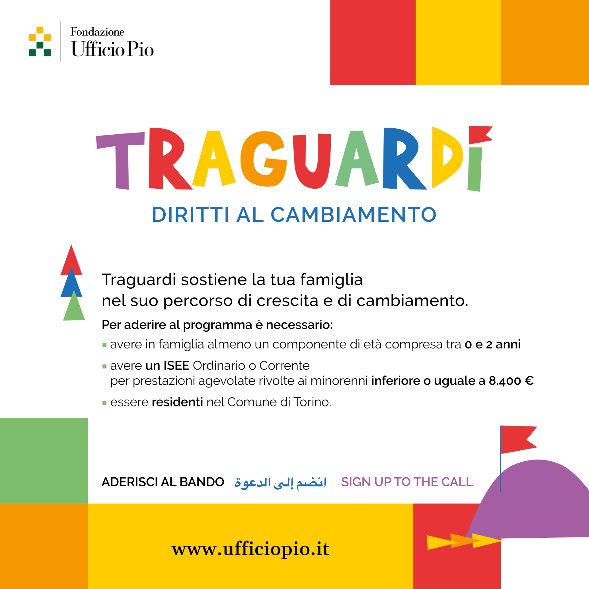 La Fondazione Ufficio Pio della Compagnia di San Paolo ha attivato il progetto Traguardi. Il programma Traguardi offre opportunità per tutti i componenti della tua famiglia. Ai più piccoli, i bimbi tra 0 e 2 anni, saranno offerte opportunità educative per sviluppare al meglio le proprie capacità. I genitori riceveranno orientamento professionale e competenze di base per accedere a lavori più sicuri, meglio retribuiti e compatibili con la cura dei figli, formazione per conoscere ed esercitare i propri diritti e migliorare la propria capacità genitoriale, esperienze aggregative per creare nuove reti di amicizie su cui fare affidamento.